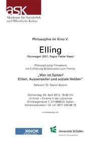 Am Freitag, den 11. Juli 2008, um 19.30 Uhr wurde die ask-Reihe „Philosophie im Kino“ im WOKI Bonn mit der fünften Folge fortgesetzt. 220 interessierte Teilnehmer stellten sich der übergeordneten Fragestellung des philosophischen Filmabends: "Wer ist Spitze? Eliten, Außenseiter und soziale Helden". Auf der Basis des preisgekrönten Films "Elling" (2001) des norwegischen Regisseurs Petter Naess wurde dabei u.a. über die gängigen Klassifikationsmuster von "oben" und "unten", Eliten und Unterschichten im Blick auf die Erfordernisse einer integrativen Gesellschaft debattiert. Die Programmbroschüre mit ausführlicheren Informationen steht rechts zum Download bereit.