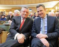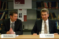 Am 12. Dezember 2008 hielt der ehemalige Bundesinnenminister Gerhart R. Baum (Bild links) im Rahmen des ask-Kolloquiums "Philosophie der Heimat" einen Vortrag zum Thema "Gibt es ein (Menschen-)Recht auf Heimat?" Nach einer thematisch-philosophischen Einführung durch Akademieleiter Dr. Martin Booms (Bild rechts) kam es im Anschluss zu einer lebhaften Diskussion mit den ca. 100 Teilnehmern der Veranstaltung. Dabei ging es u.a. um die Bestimmung des Prinzipien- und Begründungsrahmens internationaler Grundrechtsbestimmungen sowie – mit Blick auf die Menschenrechtskritik Hannah Arendts –, ob von einem Recht auf Heimat, das international als Bleiberecht kodifiziert ist, noch sinnvoll gesprochen werden kann, wenn dieses (Bleibe-)Recht mit dem Verlust sämtlicher politischer und gesellschaftlicher Teilhabemöglichkeiten der betroffenen Menschen verbunden ist.