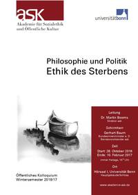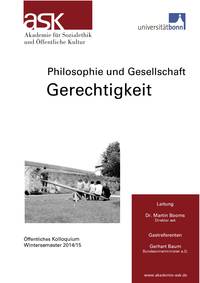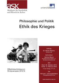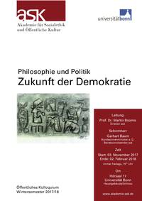 Ab 03. November 2017 setzt die Akademie die Tradition ihrer öffentlichen Winter-Kolloquien an der Universität Bonn fort. Die insgesamt 10 Kolloquien unter Leitung von ask-Direktor Prof. Dr. Martin Booms stehen allen interessierten Bürgerinnen und Bürgern offen. Sie finden immer freitags statt, um 16:15 in Hörsaal 17 der Universität Bonn, Hauptgebäude/Schloss Seitenflügel, Regina-Pacis-Weg 5, 53113 Bonn (Nähe Koblenzer Tor, Hofgartenseite). Schirmherr und Gastreferent ist wieder der ask-Beiratsvorsitzende Gerhart Baum BM a.D.