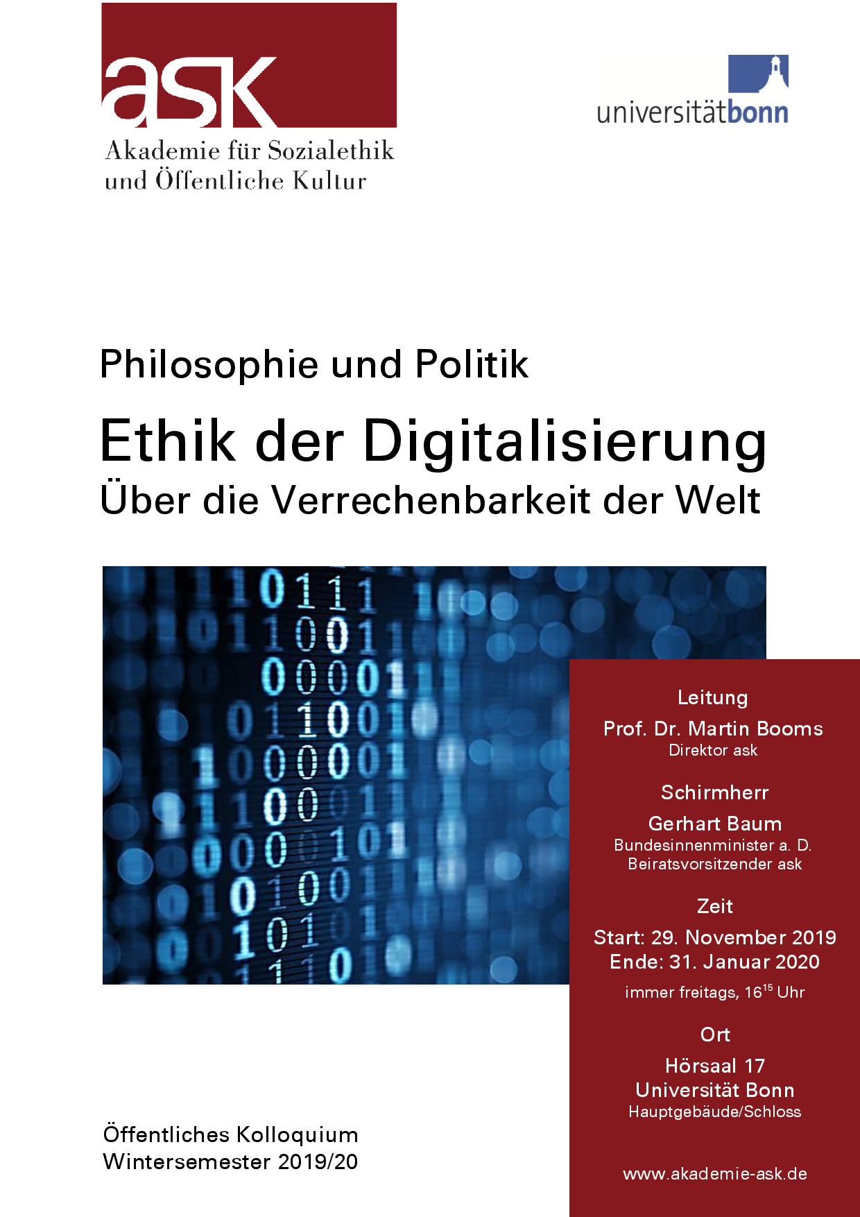 Die Tradition öffentlicher Winterkolloquien der Akademie für Sozialethik und Öffentliche Kultur in Verbindung mit der Universität Bonn geht weiter. Ab dem 29. November 2019, 16:15 Uhr geht es bis zum 31.01.2020 immer freitags in Hörsaal 17 der Universität Bonn um die "Ethik der Digitalisierung – Über die Verrechenbarkeit der Welt". Der Eintritt ist frei. Zur Veranstaltung ist ein Begleitheft erhältlich, das gegen eine Schutzgebühr vor Ort bezogen werden kann. Hauptreferent und Leiter der Reihe ist Prof. Dr. Martin Booms, Schirmherr der frühere Bundesinnenminister und ask-Beiratsvorsitzende Gerhart Baum, der auch zweimal als Gastreferent sprechen wird. Eine Übersicht steht als PDF zum Download bereit .