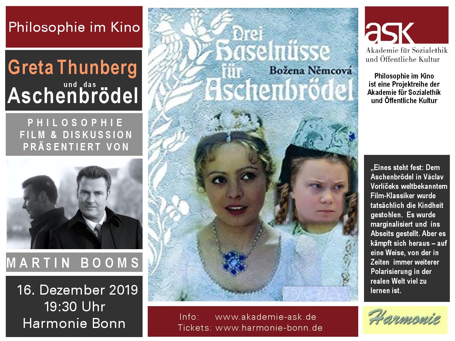 Im Dezember gib es den Jahresabschluss der Reihe "Philosophie im Kino" – mit einem Film-Klassiker in aktuellem Kontext. Gezeigt wird der weltberühmte Weihnachtsfilm "Drei Haselnüsse für Aschenbrödel" (CSSR/DDR 1973, Regie: Václav Vorlíček), den der Bonner Philosoph und ask-Direktor Prof. Dr. Martin Booms im Blick auf die aktuelle Klimabewegung auslegt: "Greta und das Aschenbrödel" lautet das Thema am Montag, 16. Dezember 2019 in der "Harmonie" in Bonn. Ein sehr besonderer, ebenso nachdenklicher wie besinnlicher Abend.