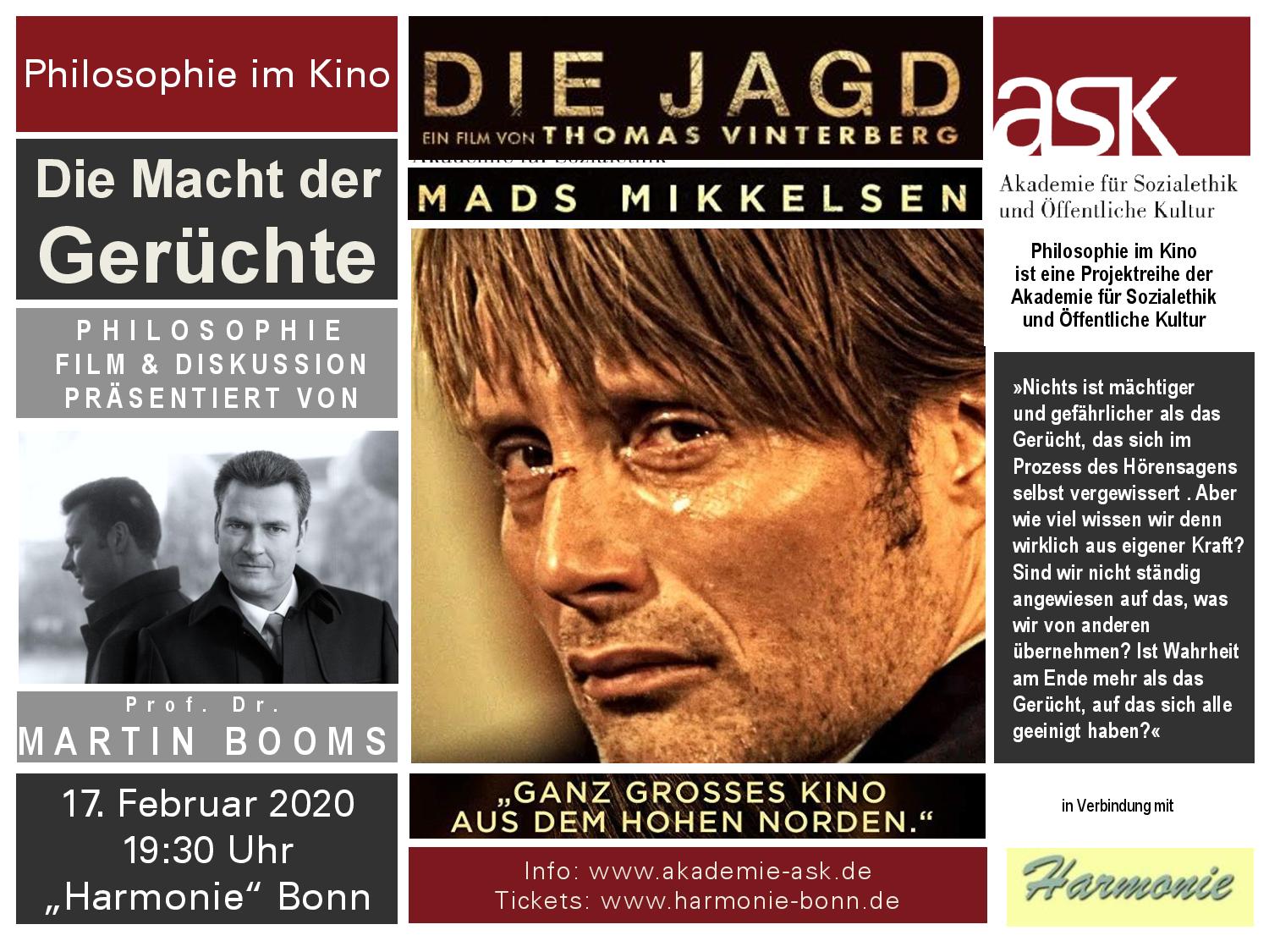 Nichts ist mächtiger und gefährlicher als das Gerücht, das sich im Prozess des Hörensagens selbst vergewissert. Aber wie viel wissen wir denn wirklich aus eigener Kraft? Sind wir nicht ständig angewiesen auf das, was wir von anderen übernehmen? Ist Wahrheit am Ende mehr als das Gerücht, auf das sich alle geeinigt haben? Darüber diskutiert ask-Direktor Prof. Dr. Martin Booms am 17. Februar 2020 mit dem Publikum in der Bonner "Harmonie". Gezeigt wird dazu der Film "Die Jagd" des dänischen Filmemachers Thomas Vinterberg mit Mads Mikkelsen in der Hauptrolle.