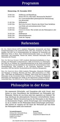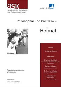 Die Reihe "Philosophie und Politik" wird im WS 2008/09 in Bonn fortgesetzt. Das Thema der mittlerweile 6. Staffel öffentlich-akademischer Kolloquien ist diesmal: "Heimat". Als Referenten zugesagt haben u.a.: Charlotte Knobloch, Präsidentin des Zentralrats der Juden in Deutschland, der amtierende Theodor-Heuss-Preisträger und frühere Bundesinnenminister Gerhart R. Baum, der Geograph und Politikberater Dr. Conrad Schetter und der neue Chefredakteuer des Bonner Generalanzeigers Andreas Tyrock.