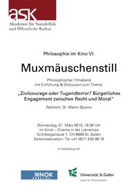 Am 14. November, 19.30 Uhr im WOKI Bonn lud die Akademie zu einer neuen Diskussionsveranstaltung der Reihe "Philosophie im Kino". Thema der mittlerweile sechsten Folge war das Verhältnis von Selbstjustiz und Zivilcourage, das entlang der Grenzlinie von subjektivem Moralempfinden und objektivem Rechtsanspruch aus philosophischer Perspektive erschlossen und mit ca. 150 Teilnehmern debattiert wurde. Als Grundlage diente der Film "Muxmäuschenstill" des deutschen Regisseurs Marcus Mittermeier. Der Programmflyer mit Einführungstext und weiteren Informationen steht auf dieser Website zum Download bereit (rechte Menüspalte, Material).